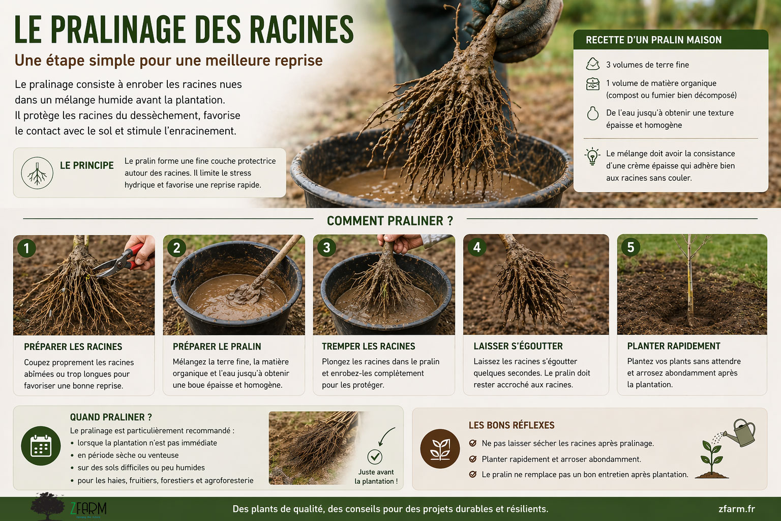 Le pralinage est une technique simple, rapide et peu coûteuse qui permet d’augmenter significativement les chances de reprise des plants en racines nues.
