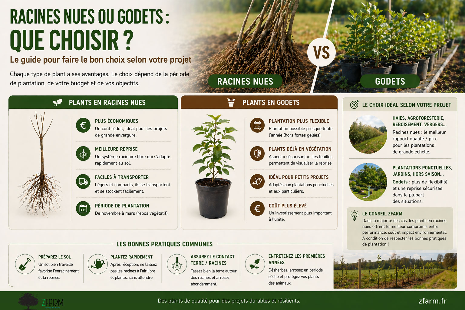 Dans la majorité des cas, les plants en racines nues offrent le meilleur compromis entre coût, performance et qualité de reprise.